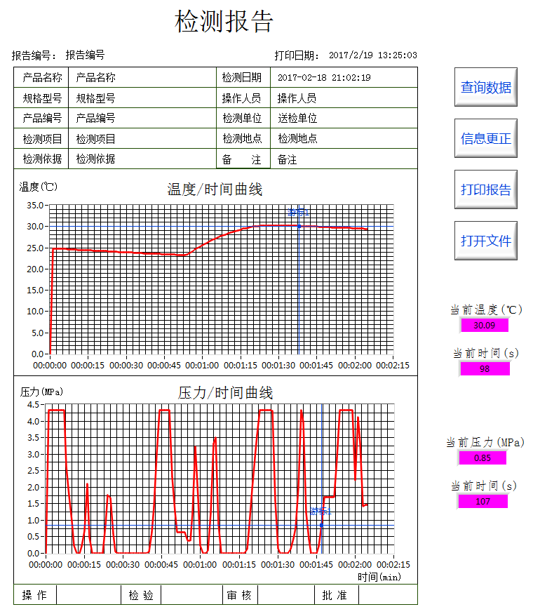 (3)1套實時數(shù)據(jù)采集、顯示、儲存運行軟件,并實時記錄測試數(shù)據(jù)、對測試結(jié)果進行判斷,以及自動生成測試報告,通過U盤進行儲存等功能;